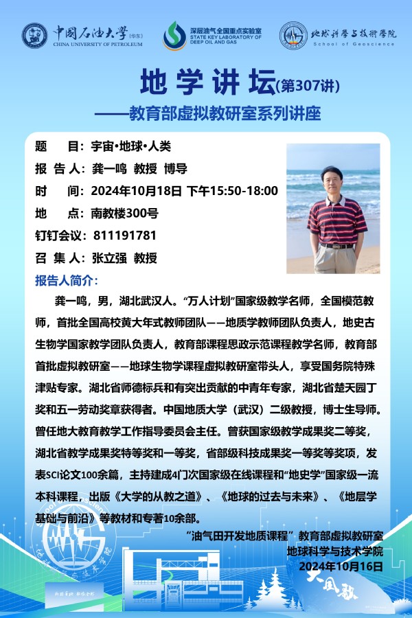 【地学讲坛第307讲】关于龚一鸣 教授 《宇宙 地球 人类》学术报告的通知
