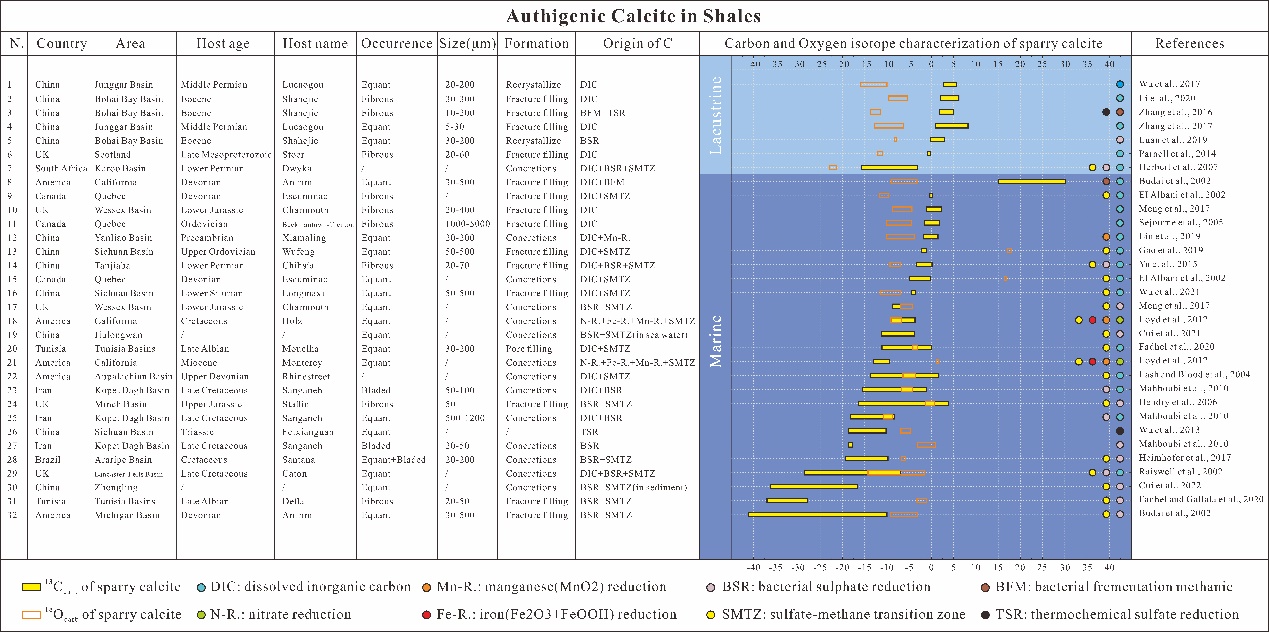 图1.页岩自生方解石分布、成因、赋存特征及同位素特征