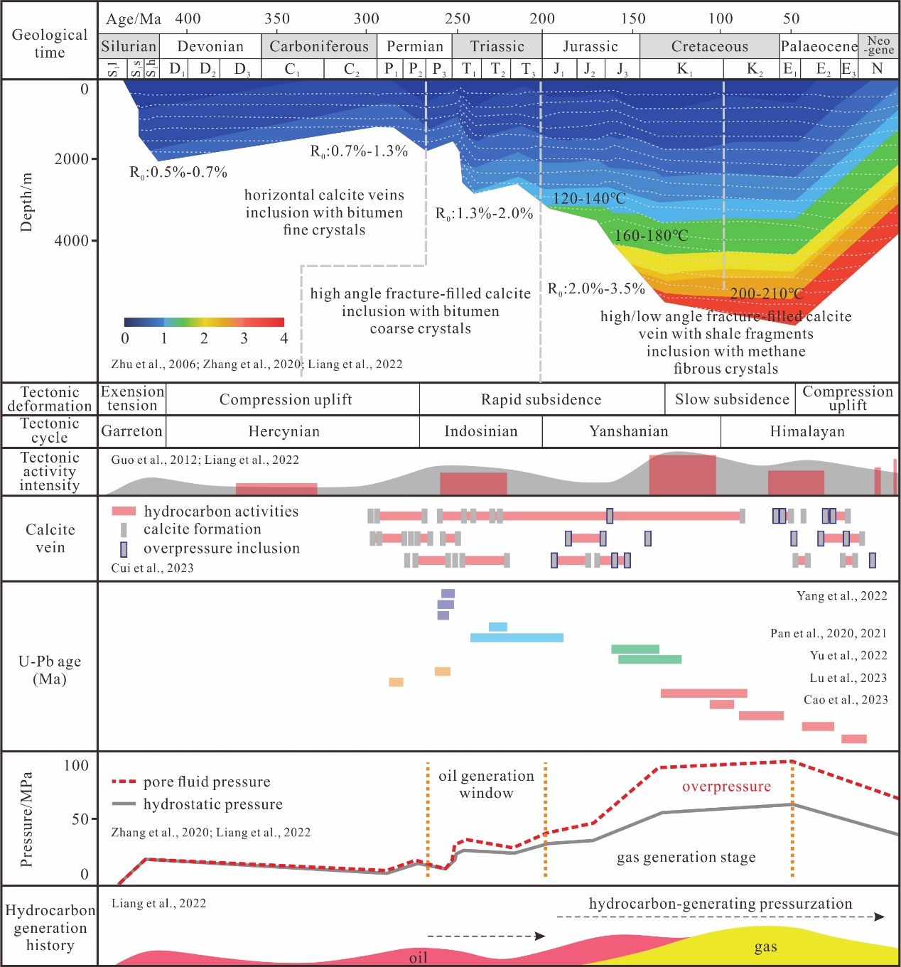 地层埋藏史数据(Zhu et al., 2006; Zhang and DePaolo, 2020; Liang et al., 2022); 构造活动强度数据(Guo et al., 2012); 方解石包裹体数据(Cui et al., 2023); 方解石U-Pb 定年数据(Pan et al., 2020; Pan et al., 2021; Yang et al., 2022; Yu et al., 2022; Lu et al., 2023; Cao et al., 2023); 地层压力数据(Zhang and DePaolo, 2020; Liang et al., 2022); 生烃史数据 (Liang et al., 2022).