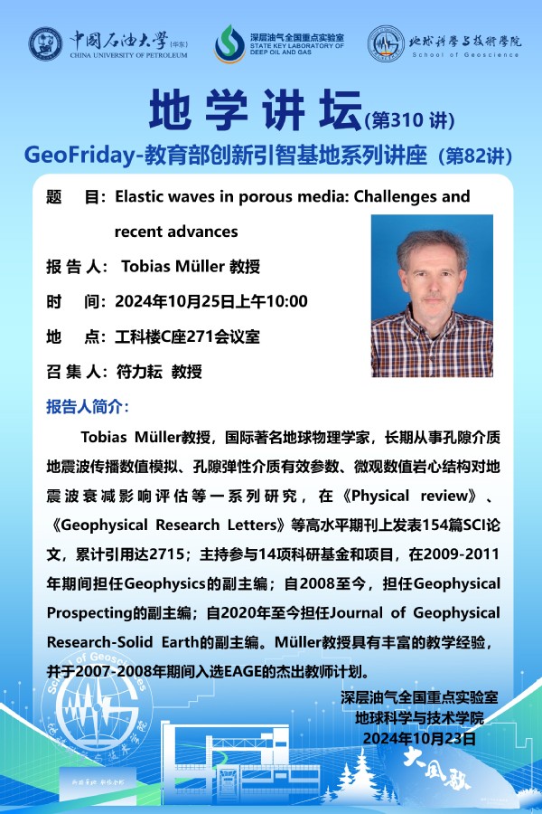 【地学讲坛第310讲】关于Tobias Müller 教授《Elastic waves in porous media: Challenges and recent advances》学术报告的通知