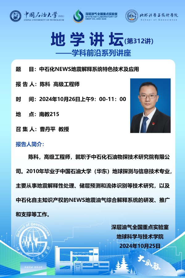【地学讲坛第312讲】关于陈科 高级工程师《中石化NEWS地震解释系统特色技术及应用》学术报告的通知