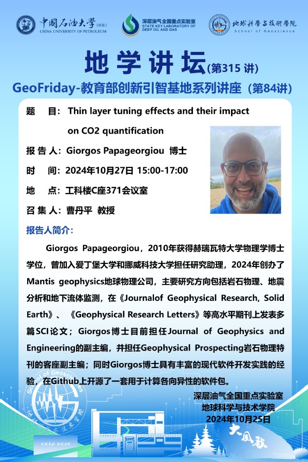 【地学讲坛第315讲】关于Giorgos Papageorgiou 博士 《Thin layer tuning effects and their impact on CO2 quantification》学术报告的通知