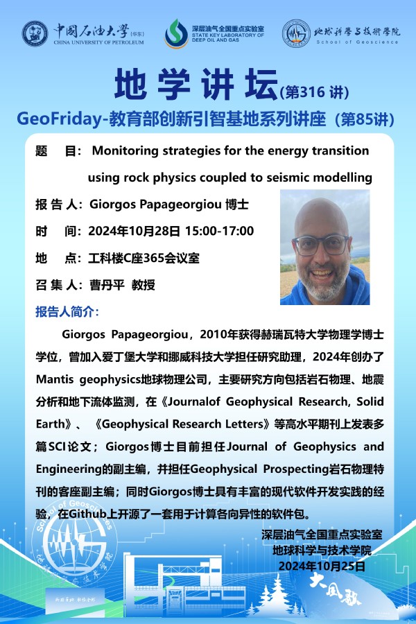 【地学讲坛第316讲】关于Giorgos Papageorgiou 博士 《Monitoring strategies for the energy transition using rock physics coupled to seismic modelling》学术报告的通知