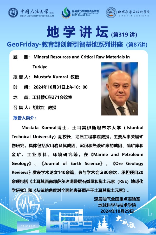 【地学讲坛第319讲】关于Mustafa Kumral 教授《Mineral Resources and Critical Raw Materials in Turkiye》学术报告的通知