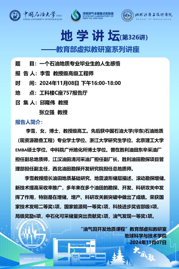 【地学讲坛第326讲】教育部虚拟教研室活动-关于李雪 教授级高工《一个石油地质专业毕业生的人生感悟》讲座的通知