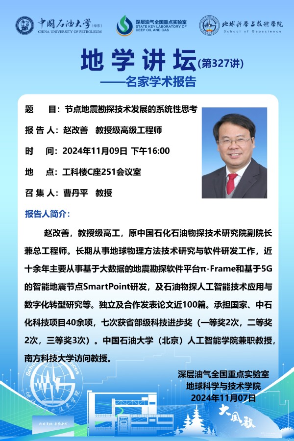 【地学讲坛第327讲】关于赵改善 教授级高级工程师 《节点地震勘探技术发展的系统性思考》学术报告的通知