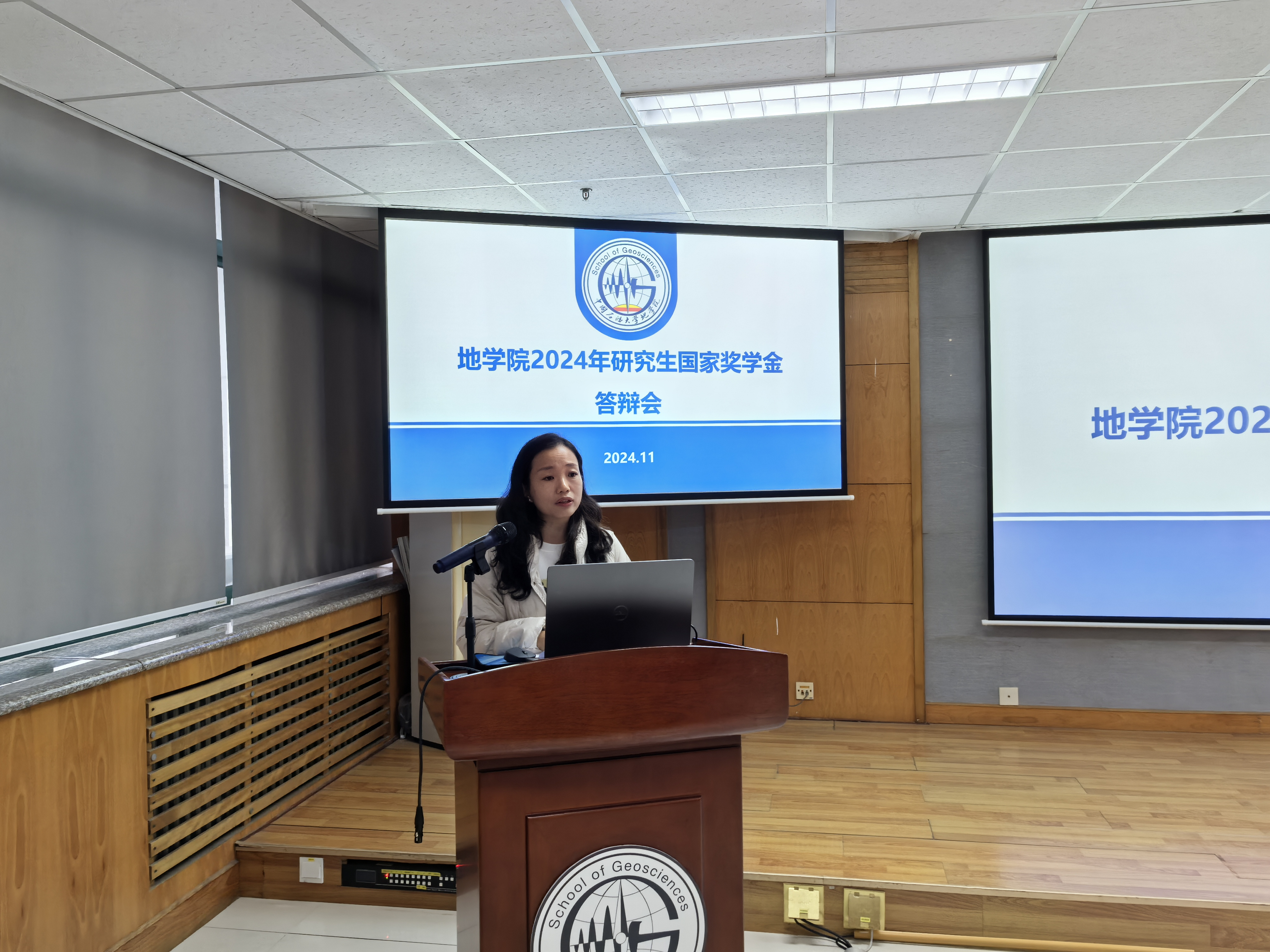 研究生辅导员杨建敏介绍了国家奖学金的设立目的意义以及评审规则,重点强调了评审纪律,同时鼓励候选人以本次评审为平台,展现个人综合实力,心怀感恩之心,发挥好带头作用。随后,候选人顺次对个人基本情况,从学术科研成果、思想成长、创新竞赛、员工工作、社会实践与志愿服务等多维度进行答辩,众多低年级研究生积极参会,认真聆听并学习。