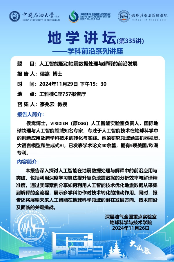【地学讲坛第335讲】关于 侯嵩 博士《人工智能驱动地震数据处理与解释的前沿发展》学术报告的通知