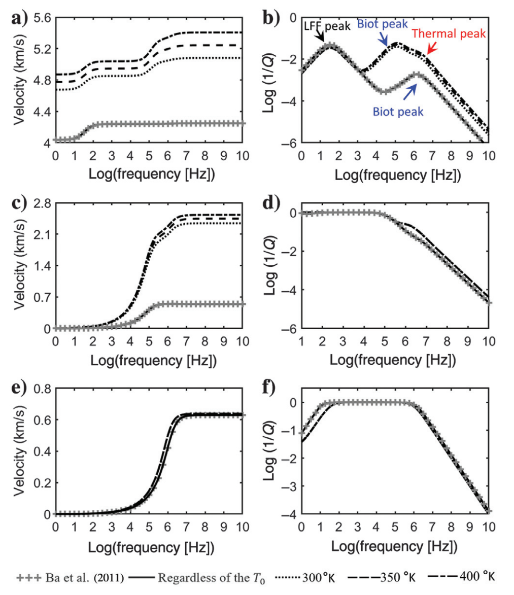 弹性波在多孔介质中的传播特性通常受到温度与变形之间耦合作用的影响,例如构造渗和气体开采,通常导致储层的非等温状态。因此,我们研究了不同环境温度(T0 = 300°K、350°K和400°K)下的色散和衰减特性。图1将结果与Ba等人(2011)的双孔隙模型(图1中的灰色十字表示)进行了比较。我们可以看到,新提出的LS-BR理论预测了三种P波和一种T波。