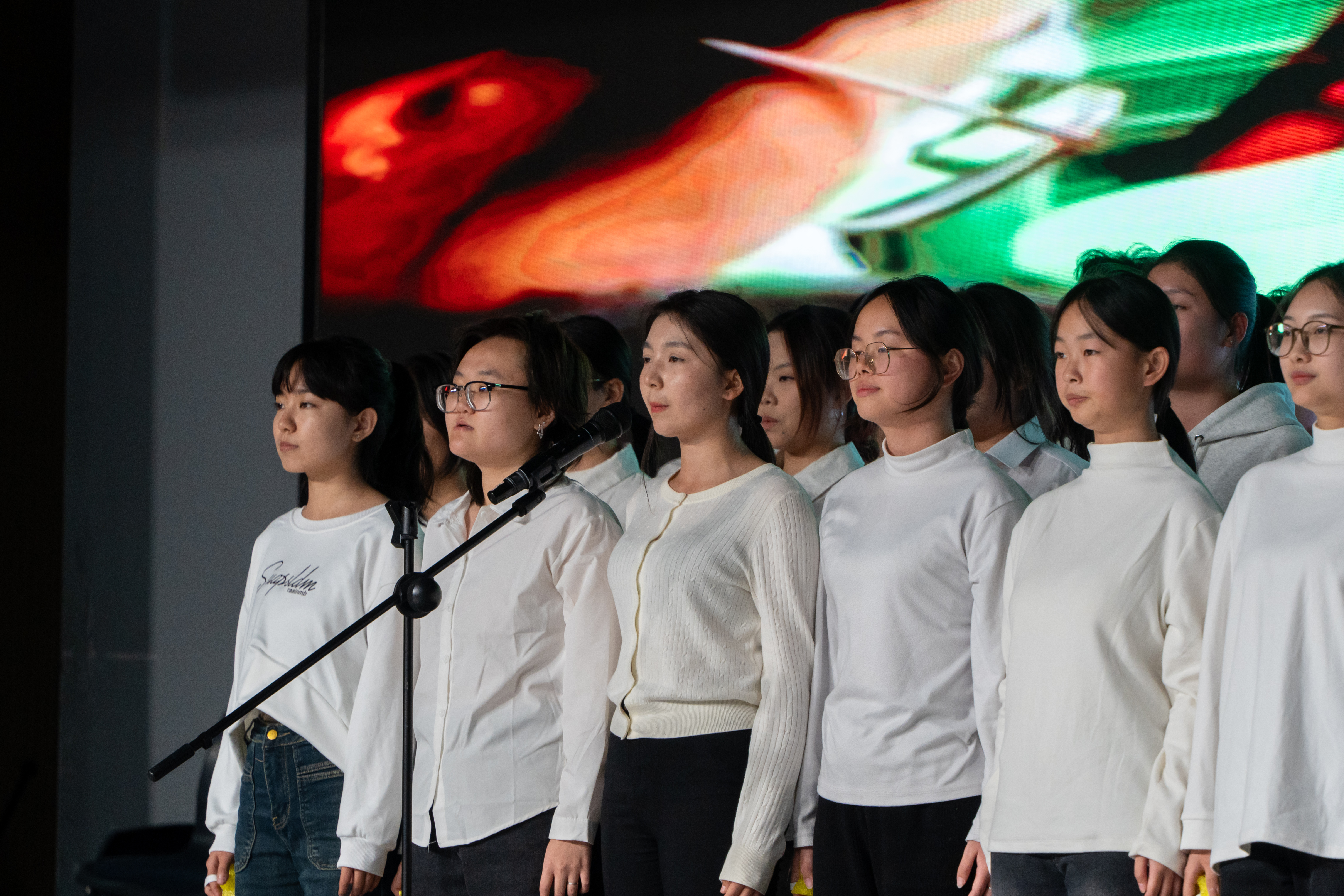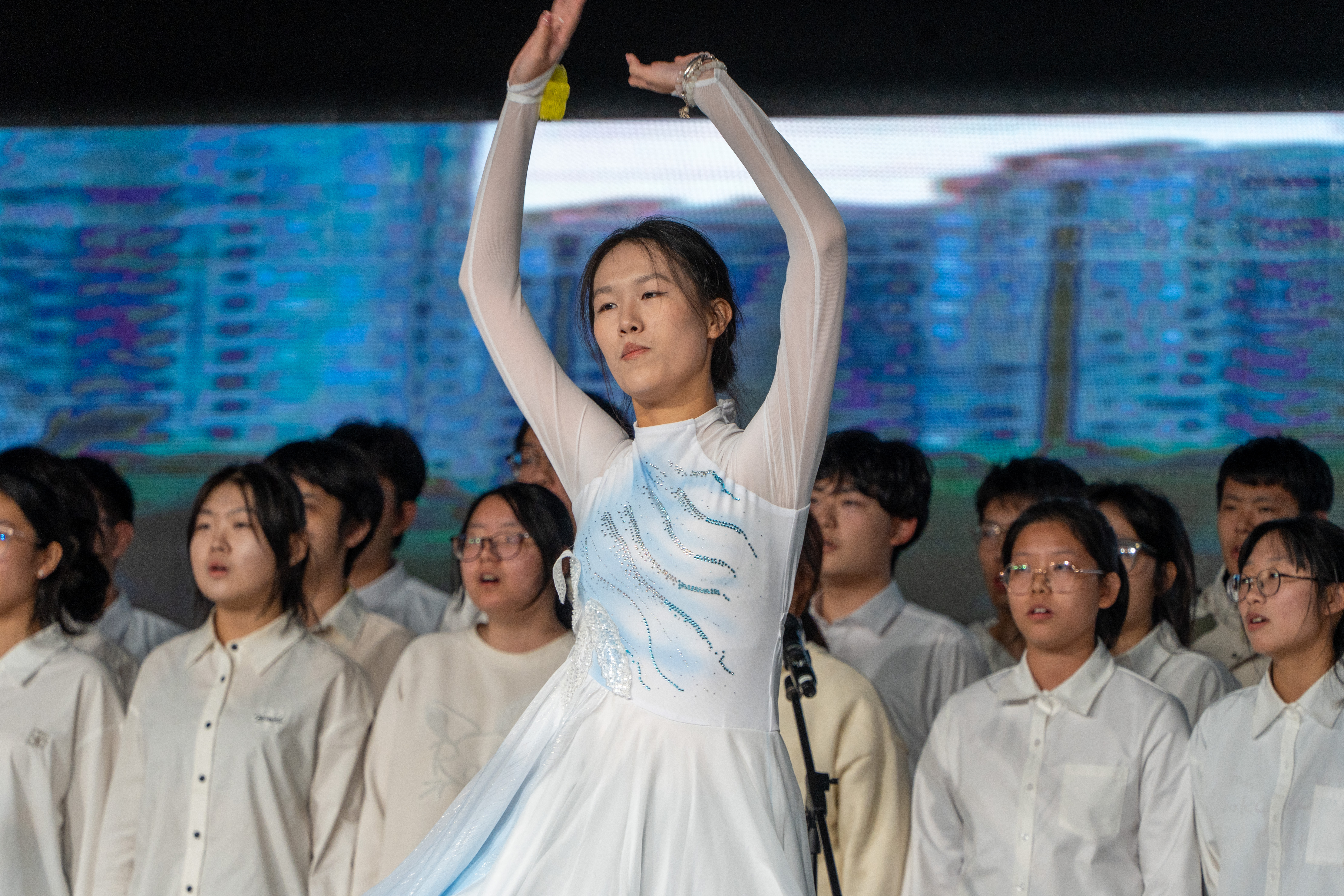 开场之时,全体合唱成员安静地现在舞台上,伴随着歌曲前奏的旋律缓缓响起,全场灯光渐亮,照亮每一位同学,为整场表演奠定了温暖感人的基调。随后,全体合唱成员齐声合唱歌曲的第一部分。当歌曲到达副歌时,全场氛围被点燃,在欢呼和喝彩中,将观众带入了一个充满温暖感人的世界。