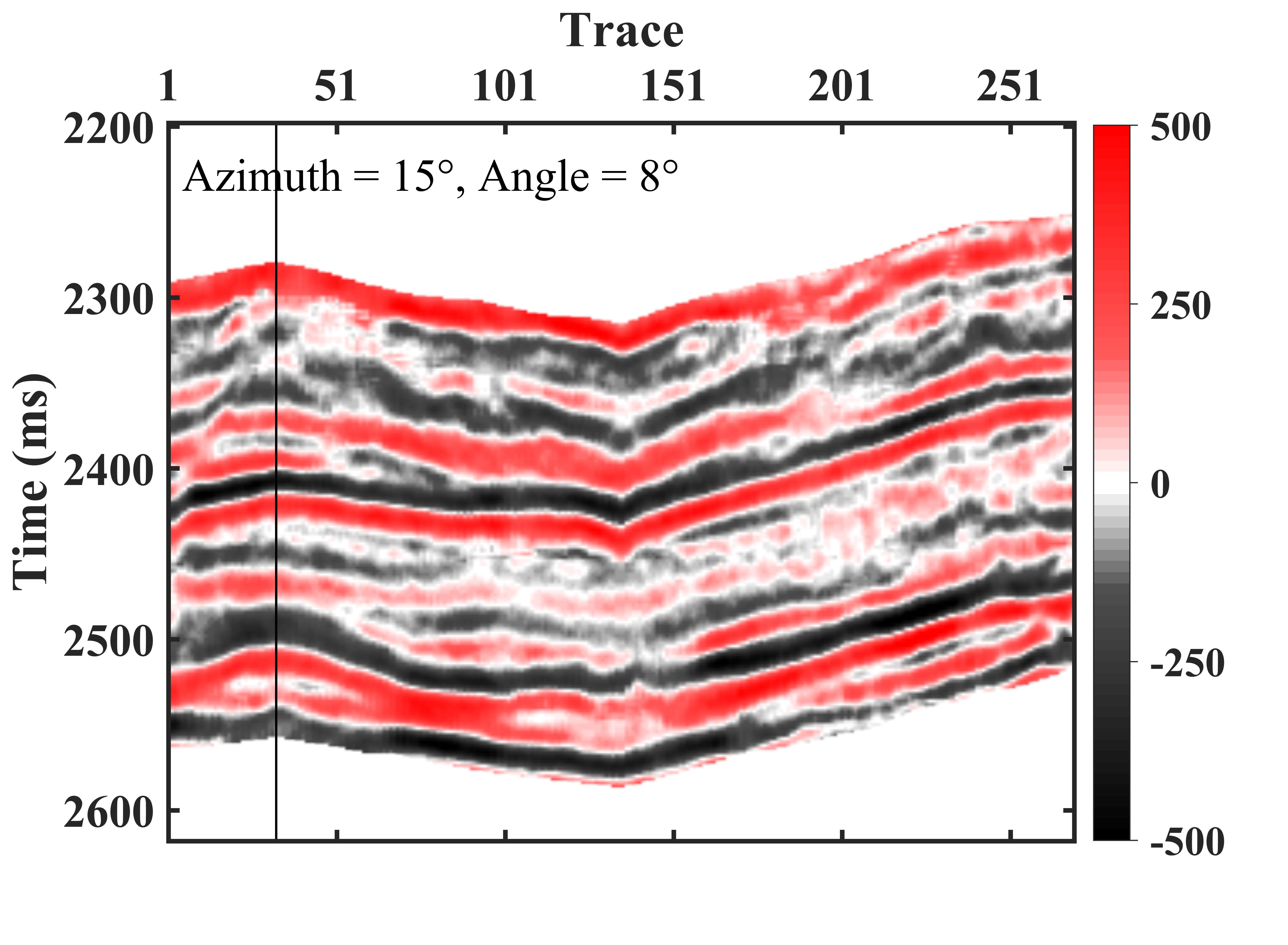 针对初始地应力作用下反射系数方程非线性强、三阶弹性模量难以估算、方程难以有效应用于实际的难题,研究团队聚焦初始水平应力作用下饱和多孔储层介质,创新性地引入了应力诱导各向异性参数以表征介质刚度矩阵及其空间扰动矩阵,一定程度消除了正反演过程中对三阶弹性模量的需要,借助弹性逆散射理论推导了流体因子表示的饱和多孔储层地震反射系数近似方程,耦合地震子波的作用,在贝叶斯反演框架下实现了流体因子地震反演(部分叠前地震数据如图4a所示),进而对含流体储层进行有效刻画(如图4b黑色箭头所示)。
