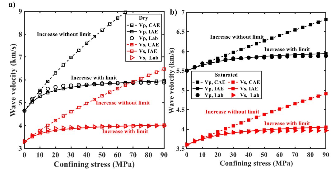 图1 常规声弹模型(conventional acoustoelasticity model, CAE)和改进声弹模型(improved acoustoelasticity model, IAE)预测的干燥(a)及饱和(b)Fontainebleau砂岩纵横波速度对比