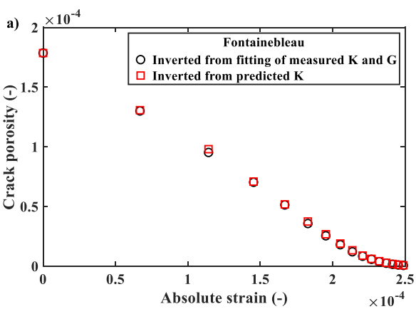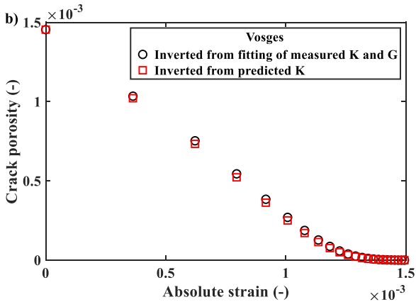 图2 Fontainebleau砂岩(a)和Vosges砂岩(b)裂隙孔隙度与岩石应变的关系