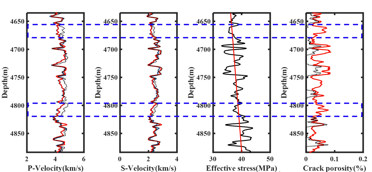 根据研究团队前期关于岩石孔裂隙应力相关性的分析结果,结合提出的双孔隙频散理论构建了耦合单轴有效应力影响的饱和多孔介质频散模型,进一步联合VRH平均公式、Wood公式、Gassmann流体替换等经典模型,提出了相应的岩石物理建模方法,基于测井数据估算储层纵横波波速。新方法与未考虑初始应力作用的常规方法纵横波估测结果对比显示,新方法估测结果精度较高(见图3),说明了新方法的有效性。