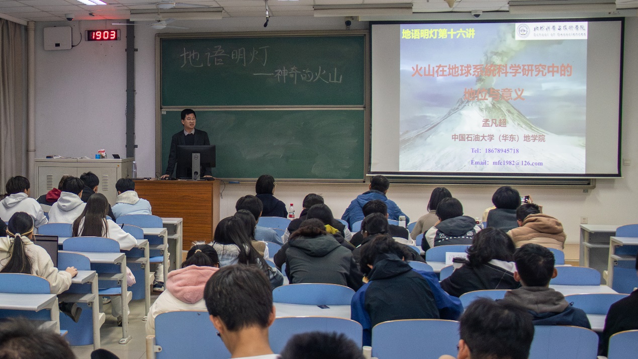 孟凡超老师以“火山在地球系统科学研究中的地位与意义”为题,为同学们开启了一场精彩的火山知识科普之旅。他将讲解内容划分为何为火山、火山资源、火山灾害、中国火山以及火山研究五大板块。孟老师从太阳系的诞生说起,阐述了太阳系中行星与卫星上的火山活动现象,深刻指出火山活动是星球富有生命力的象征,是地球的灵魂,地球可能是行星系中最年轻、最富有生命力的。在讲解何为火山时,他引经据典,讲述火山的传说故事,并深入剖析火山的结构、类型以及喷发方式等专业知识。