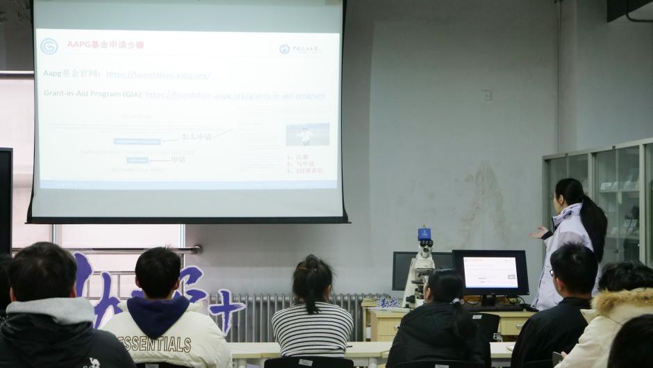 随后,AAPG全球助研金获得者赵子茹博士向同学们分享了AAPG全球助研金申请经验。本次分享对AAPG全球助研金申请的时间节点、所需摘要、预算报表和专家推荐信等方面进行了介绍,以期帮助接下来有申请意愿的师弟师妹们更好地了解申请事项,做好研究生学习的规划。