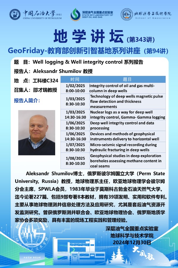 【地学讲坛第343讲】关于 Aleksandr Shumilov 教授《Well logging & Well integrity control 》系列学术报告的通知