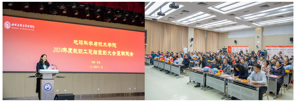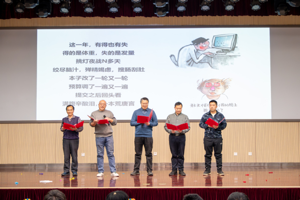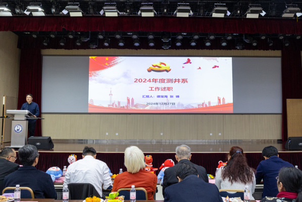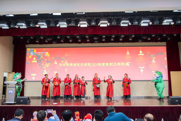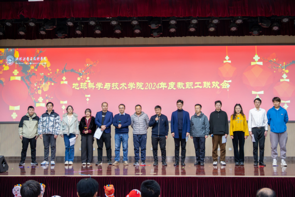 教职工联欢会由公司工会主席张军华主持。开始前,公司为“健步行”活动中表现突出的老师颁奖。随后,院属各单位分别表演节目,首先上台的是院机关全体职工,带来的节目《RED》活力四射,活跃了现场的气氛;资源系带来的节目《盘点这一年的收成》,用独具特色的方言,在轻松的氛围中回顾过去一年的进步与收获;地质系的节目《三句半》构思巧妙,在场老师掌声连连,将现场欢乐的气氛带至高潮;测井系的节目《爱如火》形式新颖奇特,传达出教职工昂扬向上的精神风貌;地物系由教师和员工共同带来歌曲联唱,特别是用录制《送你一朵小红花》表达对老师们的礼赞;最后,新入职教职工进行自我介绍并为全院教职工送上最诚挚的新年祝福。