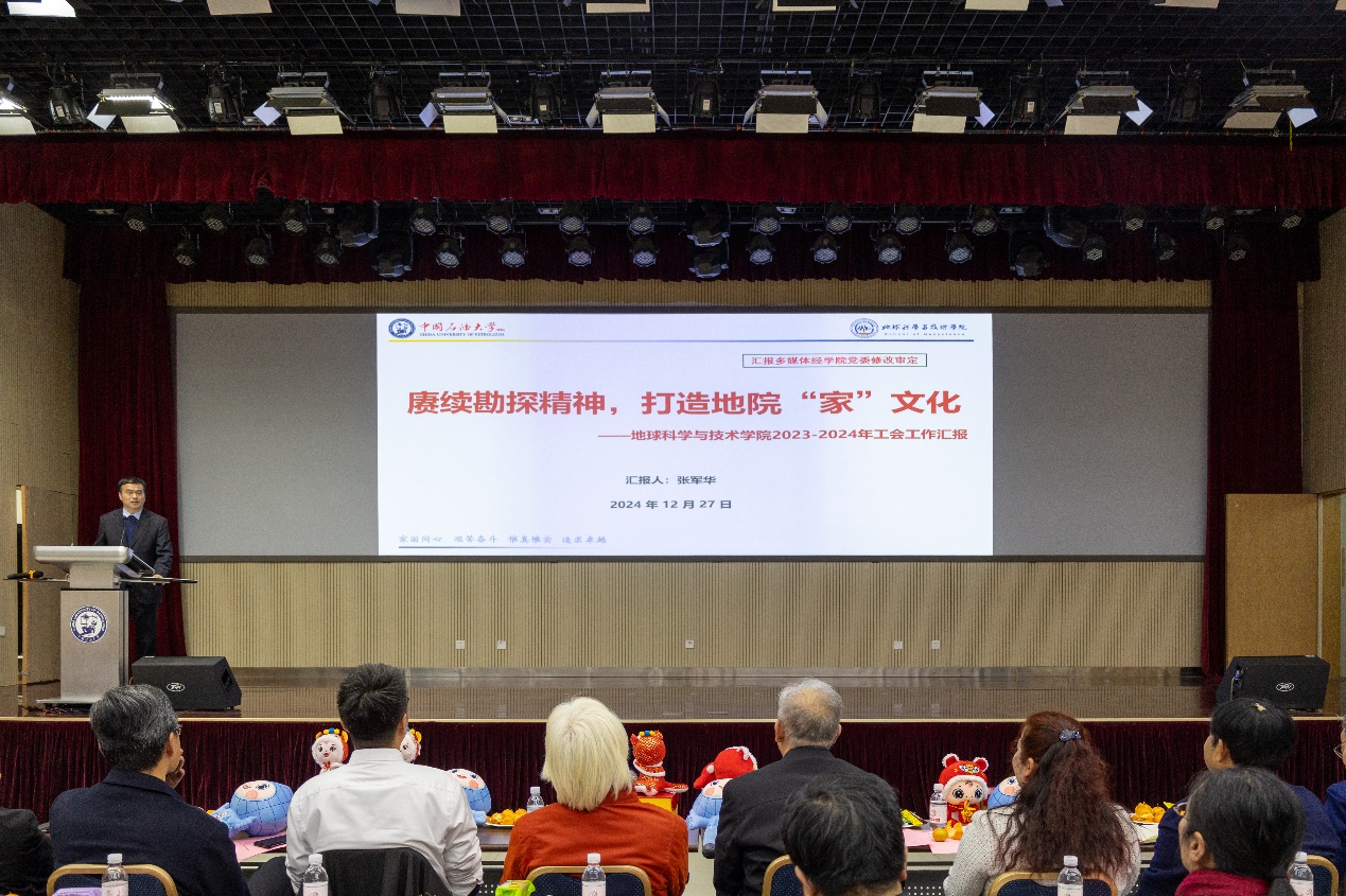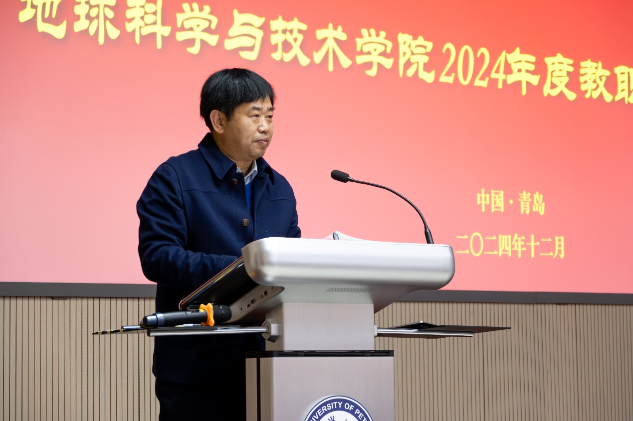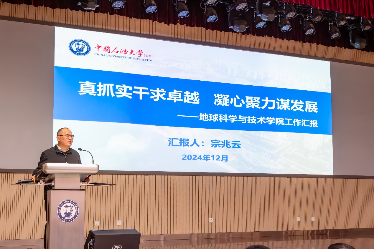 宗兆云作题为《真抓实干求卓越,凝心聚力谋发展》的公司工作报告,全方位总结和回顾了2024年公司奋力推进新一轮“双一流”建设所取得的丰硕成果和2025年奋斗的愿景目标。他表示,2024年公司加强党的全面领导,持续推动“一融双高”,事业发展取得突破性进展。深层油气基础研究能力显著提升,有组织科研助力立项转化实现重大突破;学术科研氛围进一步浓厚,学术成果取得多项新亮点;加大人才引育力度,团队队伍建设取得新进展;思政引领强基铸魂,人才培养成果斐然;人才培养平台上新高,本科生源质量大幅提升;持续完善研究生教育体系,培养质量显著提升;全力打造国际交流地学品牌,国际化水平提升明显;深化公司办公室改革,建设一流管理服务团队;全院教职工凝心聚力,多项活动赛事拔得公司头筹。面向2025年,公司将持续推进“地十条”,落实“3+N+特色(亮点)”工作方案,开展“十大行动”,大力推动公司学科可持续发展。
