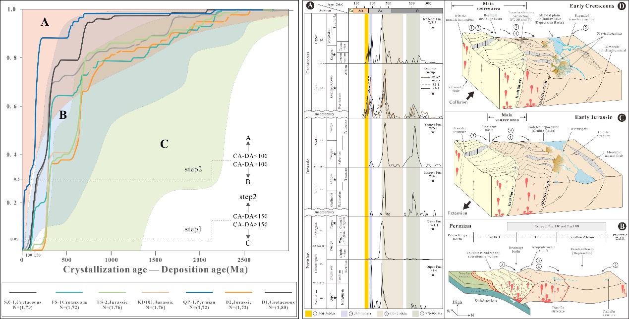 图1. 塔西南盆地中生代CA-DA间隙曲线解释的侏罗伸展背景和白垩挤压背景以及相应背景下的源汇演化格局
