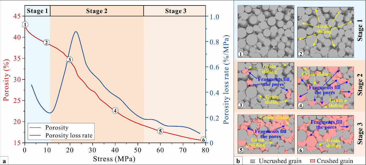 图2. 压实作用控制下的孔隙度演化过程及微观颗粒破碎、重排与孔隙充填机制