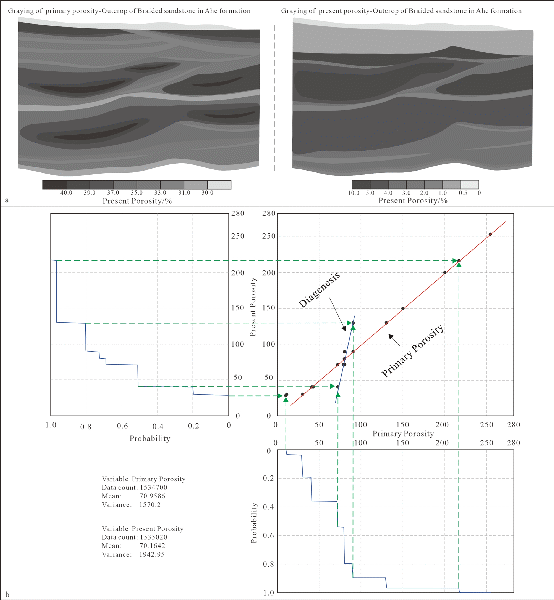 砂体尺度:研究团队利用辫状河砂岩的原生孔隙度和现今孔隙度的Q–Q图非线性相关性,指出库车中生界碎屑岩储层现今孔隙度非均质性受压实和胶结的影响较小,现今储层非均质性与原始物性非均质性的差异主要来自溶蚀作用。将来自单个样品的地质信息与辫状河砂体中当前孔隙度的非均质性相关联,可以评估由不同成岩过程引起的非均质性改变的相对程度,这对于建立地质历史时期砂体尺度的储层物性具有重要启示。