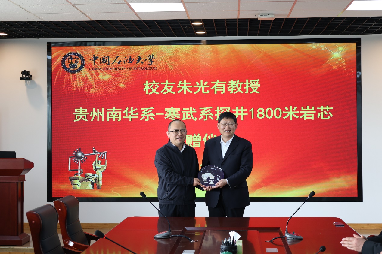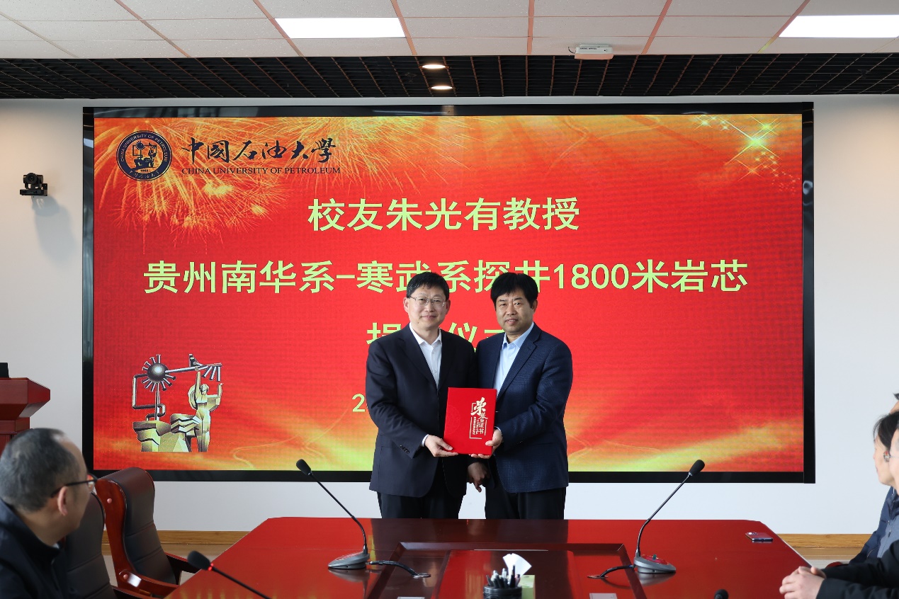 朱光有对公司和公司在自己成长过程中一直给予的支持表示感谢。指出本次捐赠的南华系-寒武系岩芯是四川盆地和塔里木盆地万米深井钻探的主要目的层系,三套黑色页岩(烃源岩)和两套白云岩是超深层的典型代表岩层,希望通过对这1800米连续岩芯的研究能为公司科研和教学提供更多的素材。