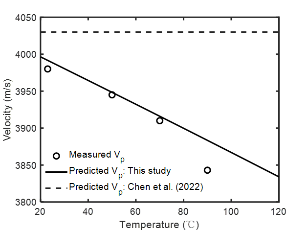 热弹性和声弹性理论分别被广泛用于研究温度场和应力场对岩石中弹性波传播的影响,然而,地球深处岩石通常同时经历高温和高压环境,其变形行为同时具备热弹性和声弹性,高温高压岩石弹性波传播受到热应力与预应力之间的耦合效应制约。本文基于应变自由能密度函数,通过引入温度场与应力场之间的交叉耦合效应,提出了一种统一热弹与声弹的热声弹性理论框架,系统描述了岩石的体积变化、预应力及其应变、热应力及其应变等行为。通过等效三阶热弹性和声弹性常数,建立了热声弹性应力-应变本构方程及其动力学方程。该理论预测了四种弹性波传播模式:热慢P波(T波)、慢S波,以及经典的快P波和快S波。其中,T波与快波存在耦合效应,而慢S波则表现出频率无关特性(图1)。实验验证表明,该模型能够准确预测高温高压岩石弹性波速的变化趋势(图2),为深入理解深部岩石的温度-压力耦合机制提供了理论支撑。