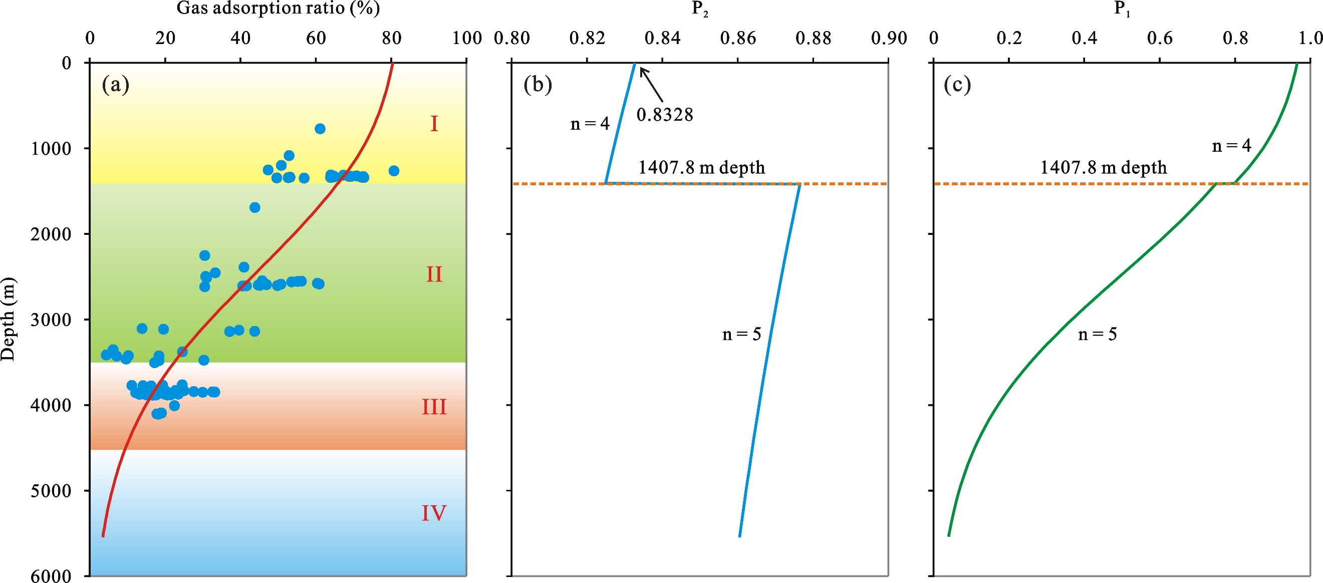 图2. 中国页岩气吸附比例演化剖面(a),以四川盆地为例,页岩中气体参与吸附的概率(b)与单个气体分子发生吸附的概率(c)演化剖面
