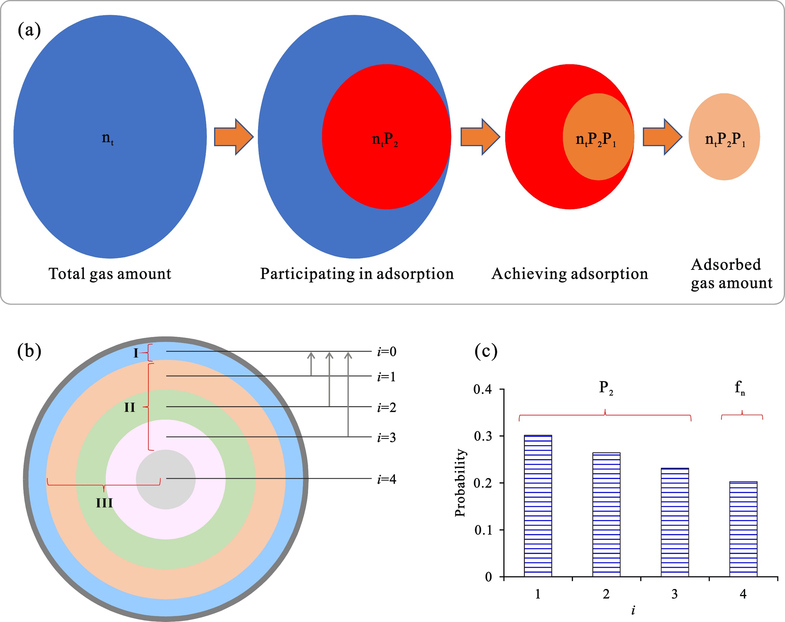 图1. 吸附气与总含气关系(a),页岩纳米孔隙中轨道分布,以n=4为例(b),分子概率分布(c);在图b中,I代表基态,II代表发生能级跃迁的激发态,III代表激发态