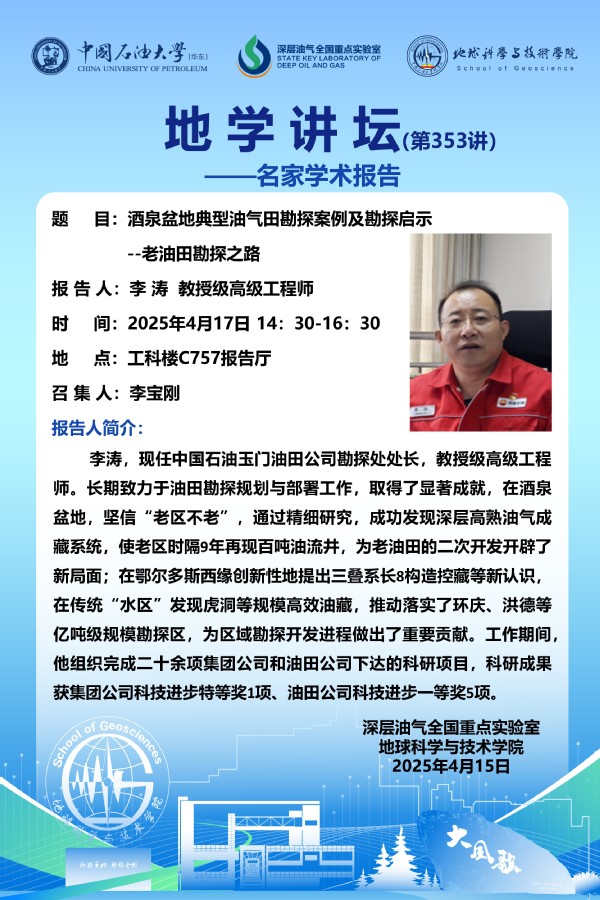 【地学讲坛第353讲】关于李涛 正高级工程师《酒泉盆地典型油气田勘探案例及勘探启示 --老油田勘探之路》学术报告的通知