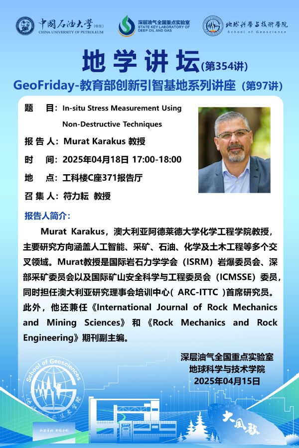 【地学讲坛第354讲】关于 Murat Karakus 教授《In-situ Stress Measurement Using Non-Destructive Techniques》学术报告的通知