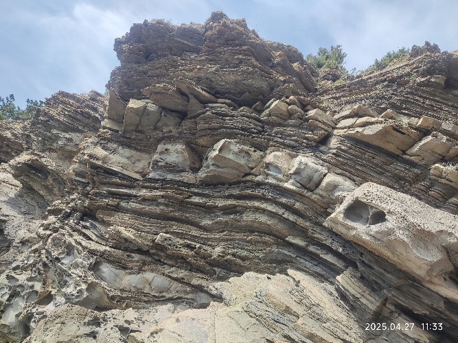 3.象鼻山:单斜构造(倾角15°~70°)与北西向断裂的共轭发育,构成研究地壳浅表应力分布的天然实验室。通过无人机航磁测量,发现山体深部存在隐伏断裂带,为海岛稳定性评估提供新视角。