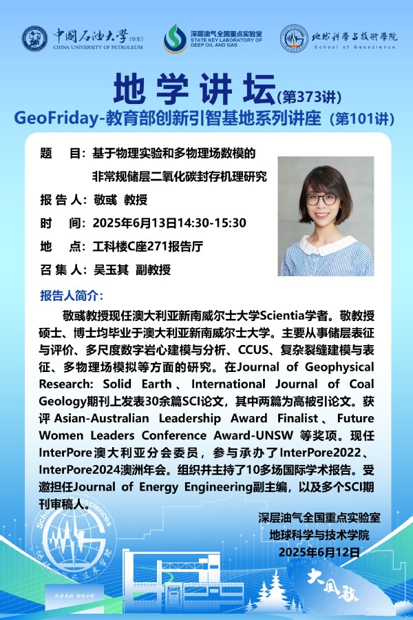 【地学讲坛第373讲】关于敬彧教授《基于物理实验和多物理场数模的非常规储层二氧化碳封存机理研究》学术报告的通知