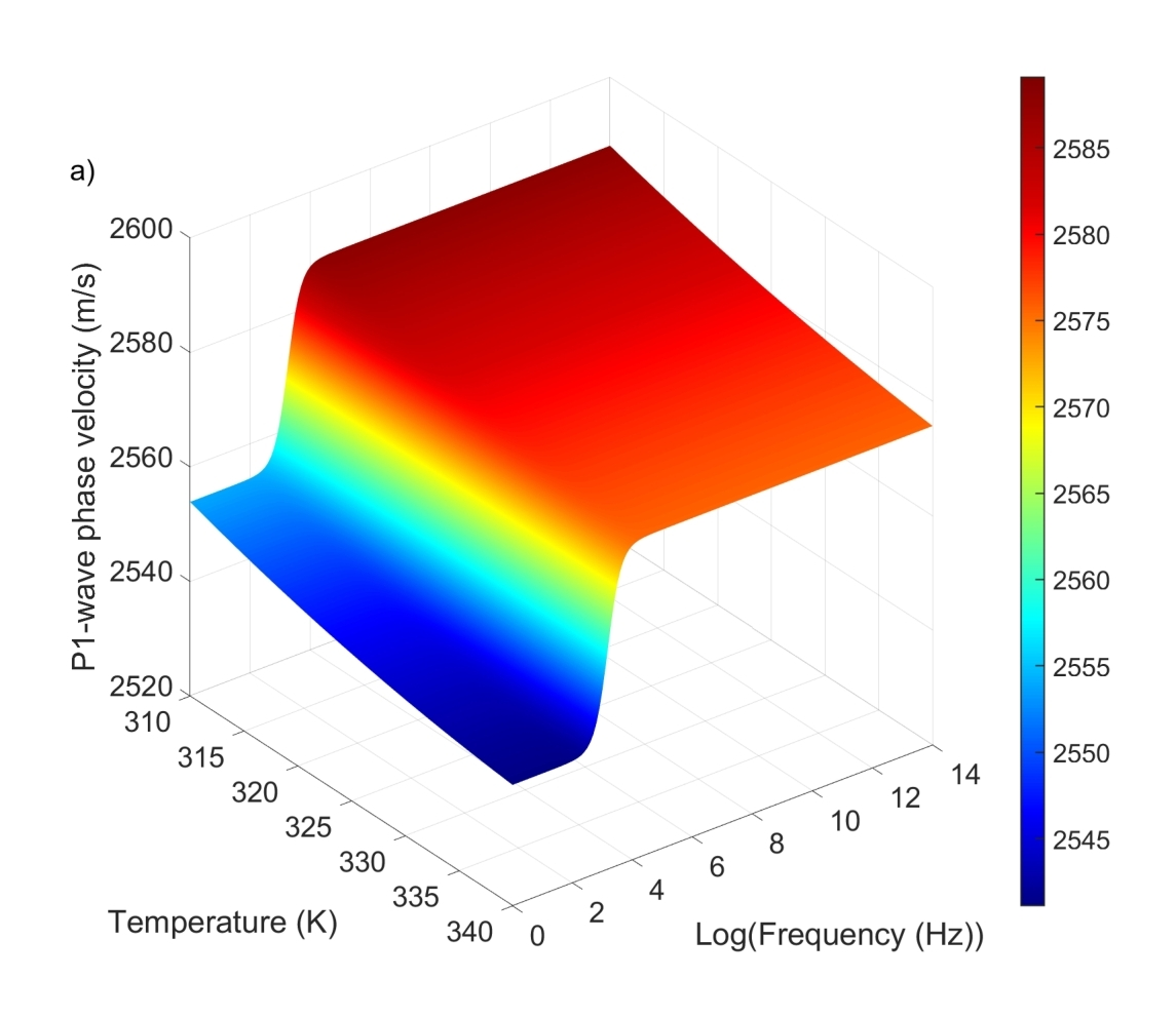 图1. scCO2饱和砂岩中快P波(a)、慢P波(b)的相速度与频率和温度的变化关系