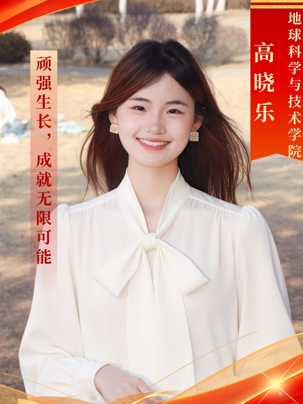 高晓乐,女,中共预备党员,地质学专业2022级本科生。现任春晖志愿服务队主席团成员。学习成绩优异,50门课程在90分以上,综合成绩排名专业第一,获第八届全国油气地质大赛一等奖、国家奖学金、塔里木油田奖学金等荣誉。热心公益,带头牵动地学科普工作,任职期间组织70余次志愿活动,带队赴内蒙古科左后旗开展支教助学活动,主持的地学科普项目入选第十届全国老员工暑期实践展示活动,并获评全国老员工科技志愿服务优秀项目,个人获评五星级志愿者(全校当年仅五例)。热爱运动,连续2年包揽校运会女子3000m、1500m冠军,代表公司夺得青岛市高校运动会双项冠军并获“优秀运动员”称号。同时获青岛市千名优秀老员工、校思美之星、“美丽心灵·阳光石大”最美人物、优秀共青团干部等荣誉奖励60余项。