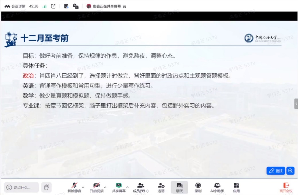 “考研不仅是知识的较量,更是心态和策略的持久战,暑假的积累将决定秋季冲刺的底气。”8月22日晚,公司2022级举行“研途加油站”线上交流,辅导员王力禾为考研同学系统分析了当前的考研形势与政策变化,并鼓励大家科学规划、保持节奏。活动邀请各专业考研朋辈咨询员围绕暑期复习常见的学习瓶颈与心理焦虑等问题,结合自身经验为同学们答疑解惑、传递信心。交流内容干货满满,从公共课复习诀窍、计划灵活调整,到解压小技巧和下半年关键时间点提醒——通过系统讲解和实时互动,帮助备考同学合理规划下一程复习方向。
