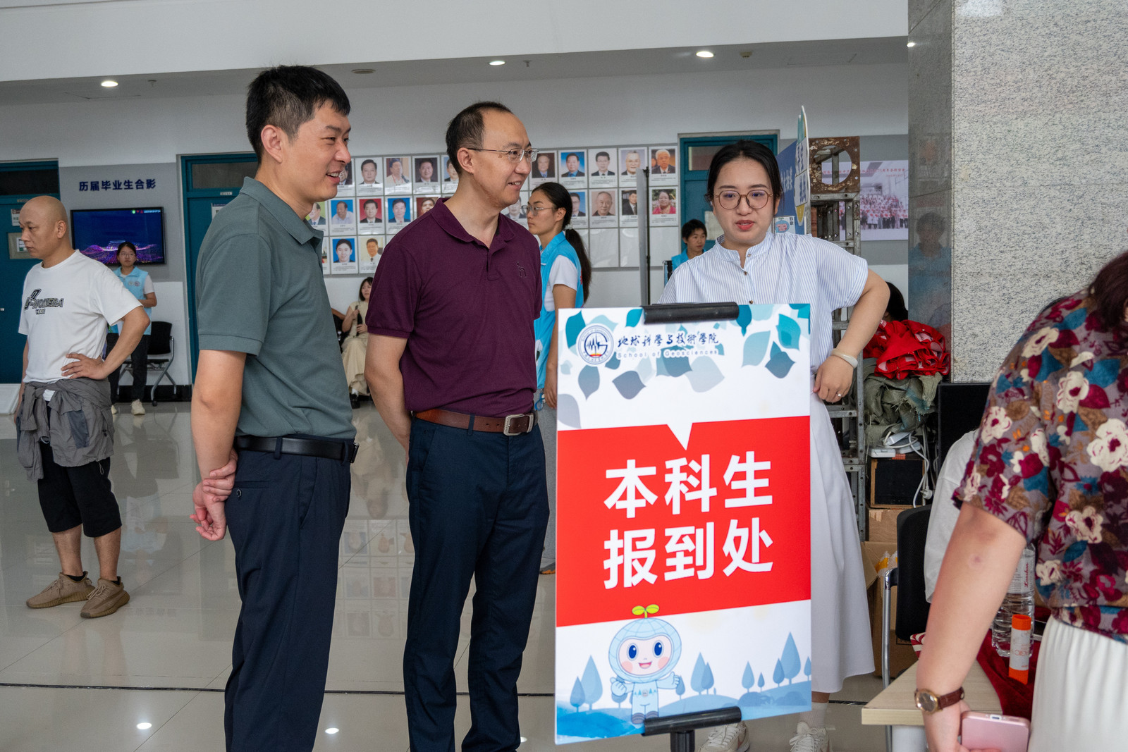 穆洋洋,新生班主任和辅导员王佳交流现场情况 杨树航摄