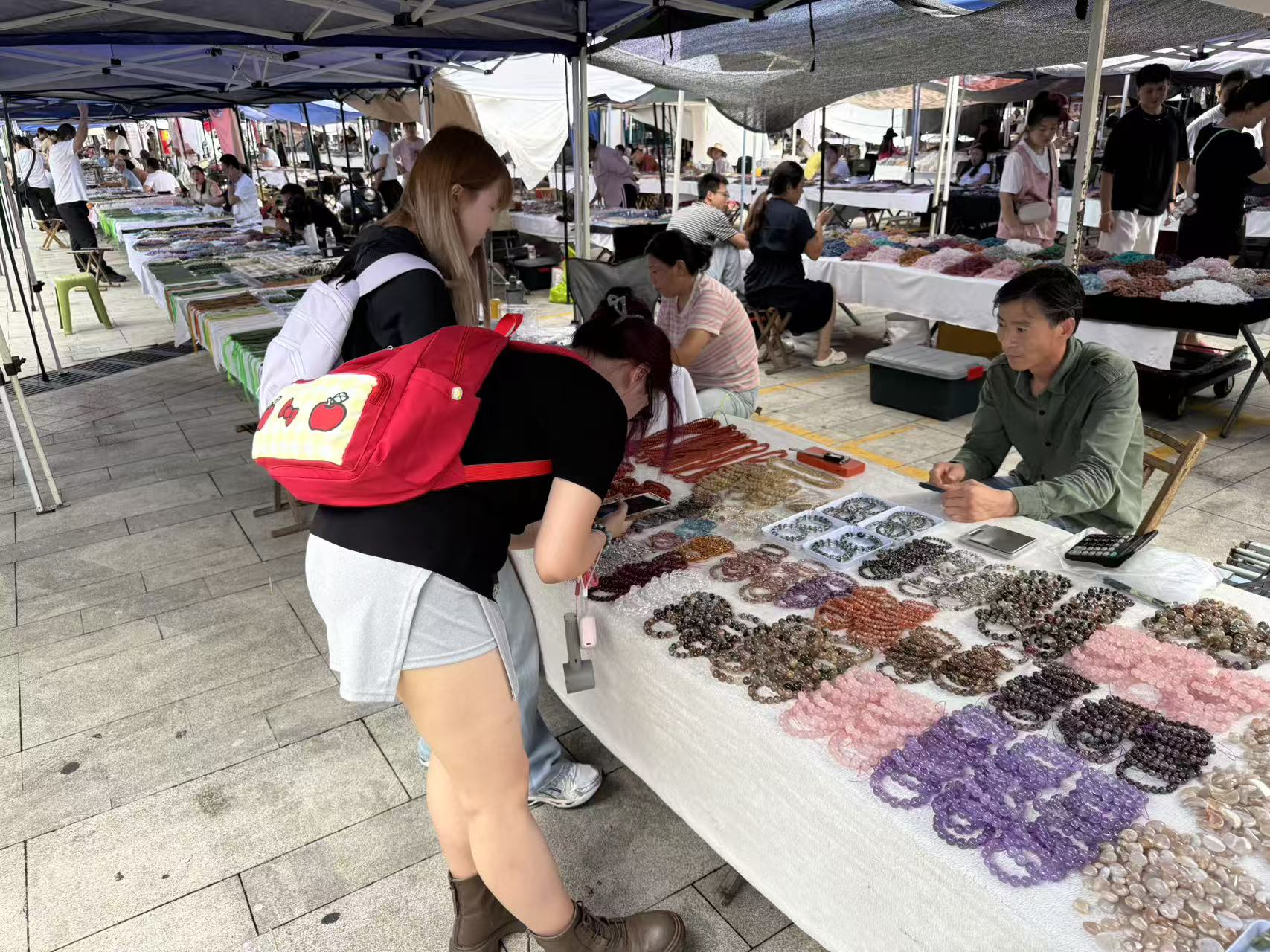 本次实习活动的高潮无疑是亲身体验被誉为“全世界最大水晶交易市场”的奔牛与淘晶两大水晶早市。凌晨三点,当城市还在沉睡,这里早已是人声鼎沸、灯火通明。超过三千个摊位上,琳琅满目的水晶原石、半成品与成品令人目不暇接。同学们不仅现场学习了不同类别水晶的识别技巧,了解了市场一线的行情动态,更被这里浓厚的国际商贸氛围所震撼:大量的电商主播正用流利的英语、西班牙语、日语、阿拉伯语等多种语言,通过Tiktok,SHEIN, TEMU等网络平台向全球各地的客户实时展示、销售水晶产品。这一场景,让来自校内不同专业的同学们深刻感受到了数字化时代全球贸易的强大脉动。