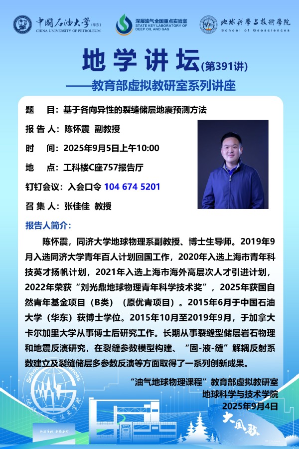 【地学讲坛第391讲】教育部虚拟教研室活动-关于陈怀震副教授 《基于各向异性的裂缝储层地震预测方法》讲座的通知