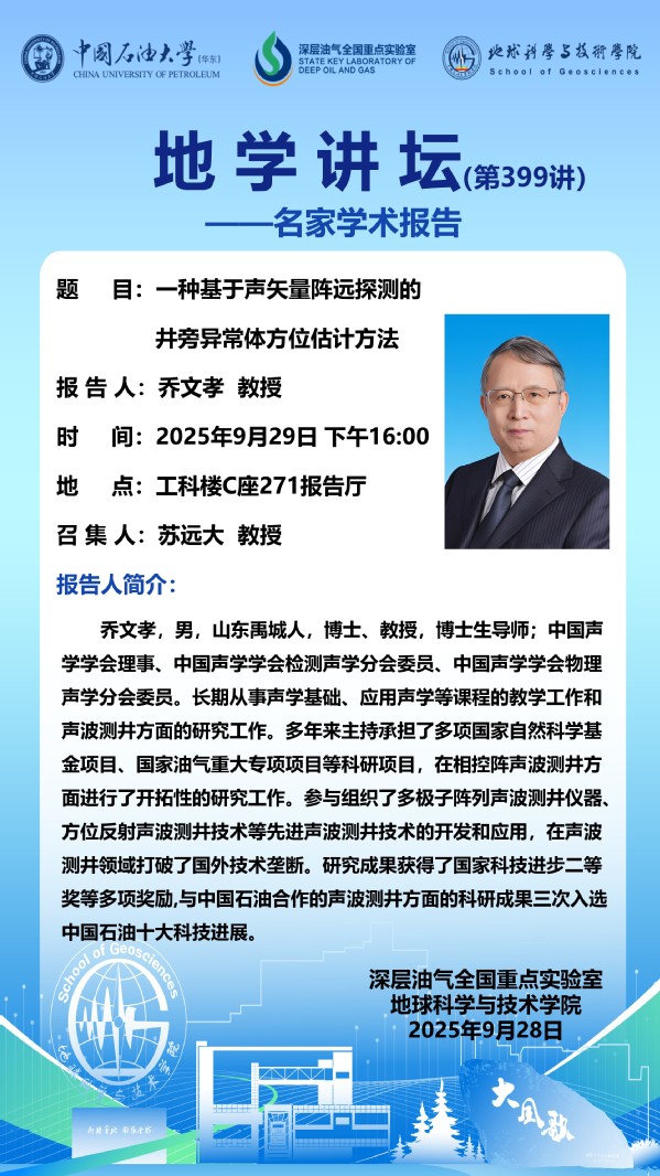 【地学讲坛第399讲】关于乔文孝教授《一种基于声矢量阵远探测的井旁异常体方位估计方法》学术报告的通知