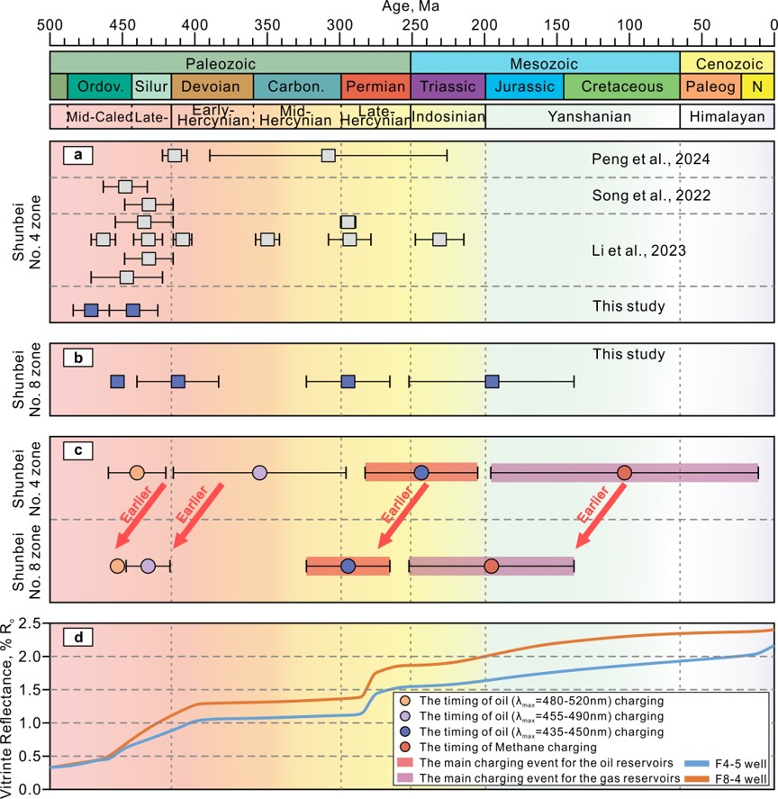 十大体育网站郝芳院士团队以顺北油气田两条主要走滑断层(顺北4号和顺北8号走滑断层)为研究对象,通过方解石脉的U-Pb定年确定走滑断层活动的绝对时间,并重建构造历史;在U-Pb地质年代学框架内,通过流体包裹体分析建立多阶段油气充注的年代学;通过综合地球化学和时间分析,识别主要的聚集事件。通过阐明断层激活与油气迁移之间的时空关系,量化了关键时期的成藏因素,重建了不同走滑系统之间的差异聚集过程,以及推进了对超深层、受断层控制的环境中油气富集机制的理解。