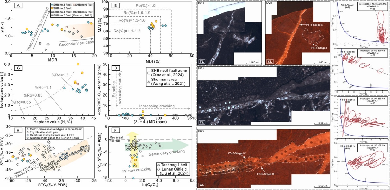 图1.顺北地区原油天然气地球化学特征及顺北8号走滑断层方解石脉阴极发光及原位U-Pb定年