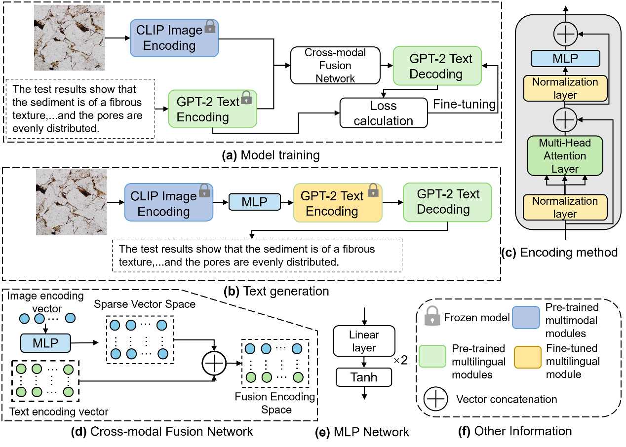 岩石薄片鉴定是一项分析岩性、构造、成岩作用及含油情况的有效手段,在地质、地球物理、石油勘探等领域发挥着关键作用。针对岩石薄片鉴定通常存在人为主观性强、工作效率低、经验门槛高等问题,我们提出了一种名为ThinGPT的多模态映射网络,旨在解决沉积岩薄片描述中存在的主观性强、效率低下及专业知识要求高等问题。该模型通过对比语言-图像预训练(CLIP)和生成式预训练模型(GPT-2)的特征空间对齐,实现了对岩石薄片图像的智能化描述。ThinGPT首次将大型语言模型(LLM)以轻量化架构应用于岩石薄片描述领域,对地质学、地球物理学和石油勘探领域的智能化发展具有重要意义。