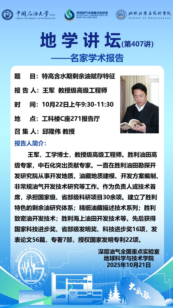 【地学讲坛第407讲】关于王军 教授级高级工程师《特高含水期剩余油赋存特征》学术报告的通知