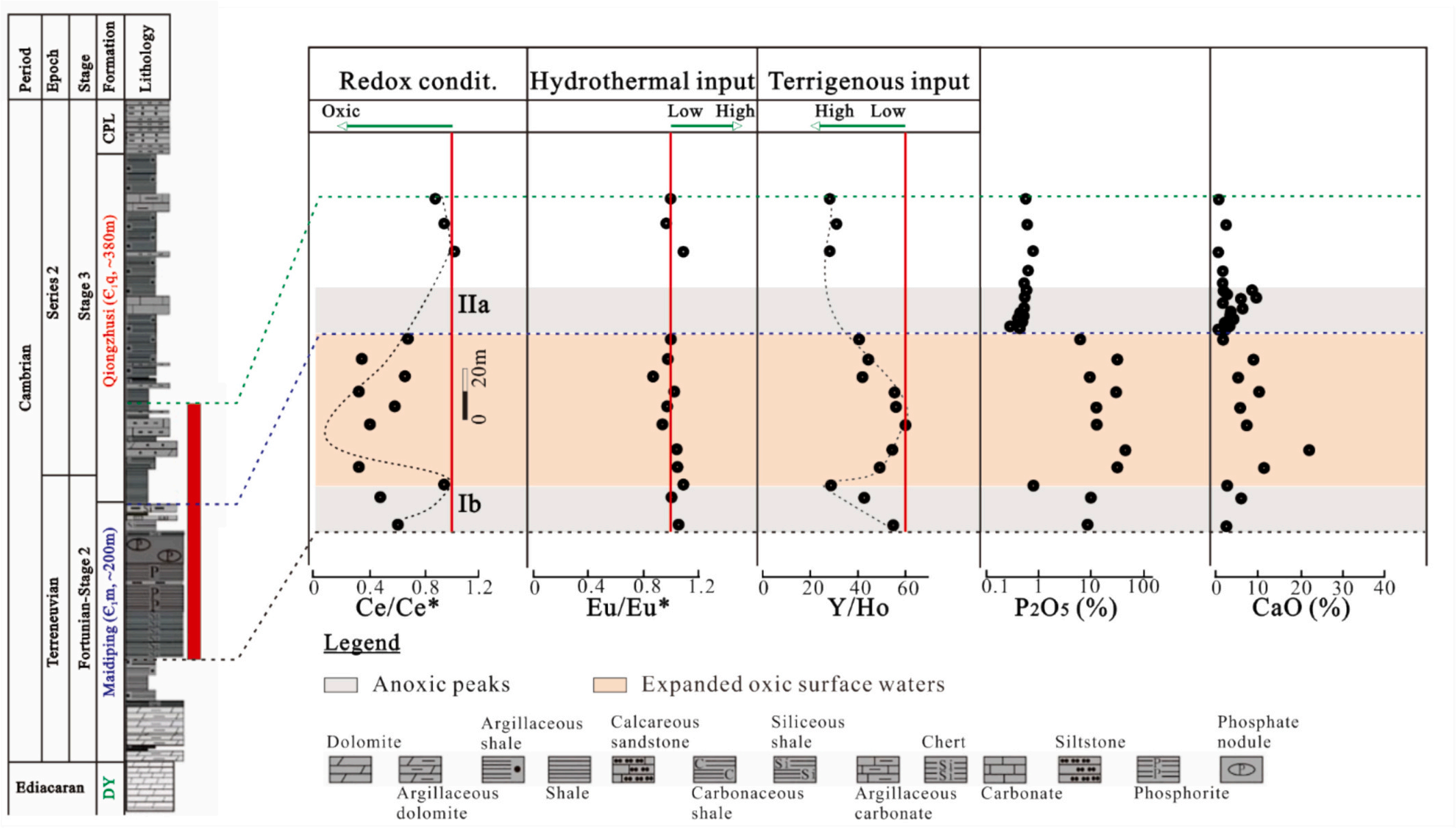 本研究从扬子板块青川-资阳-宜宾陆架盆地内的两口深层钻井(>4000 m)采集了大量岩芯样品,对其进行了薄片光学显微镜鉴定、TOC含量、分子标志物组成、无机元素组成(包括主量、微量和稀土元素)等一系列的地球化学分析测试。结果表明,早寒武系地层具有明显的Ce负异常(低至0.2)和正的姥鲛烷/植烷值偏移,在531至526Ma之间存在普遍的缺氧条件(图1);主量元素(如Al、Fe、Mn)、微量元素比值(如Rb/Sr、Sr/Cu)和稀土元素参数(ΣREE/ΣHREE、Y/Ho)变化表明古气候在干早期和湿润期之间波动;高伽马烷指数值(达0.41)、β-胡萝卜烷的存在、Sr/Ba比值升高以及高δ18O值(高达-4.87%)指示干旱期具有高盐度和强蒸发性的特点;高的碳优势指标(CPI>1)、强的δ13C负偏移(<-24%)、高2-甲基藿烷含量(最高为2.48%)和4-甲基甾烷指数(最高为20%)(图2)表明沉积有机质主要来源于蓝藻、变形菌和沟鞭藻类等。此外,含氧、高盐度、蒸发的富Ca-P水体与多样的小型贝壳化石同时存在表明了研究区可以为复杂生物体的出现和爆发提供有利环境。这一研究结果为重建寒武纪生命大爆发期间海洋生态系统的古环境条件提供了新的见解。