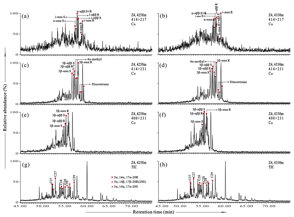 图2 MRM 色谱图(即包含MRM跃迁414>217、414>231、400>231 的色质图)显示所分析早寒武世岩芯中甾烷的典型分布