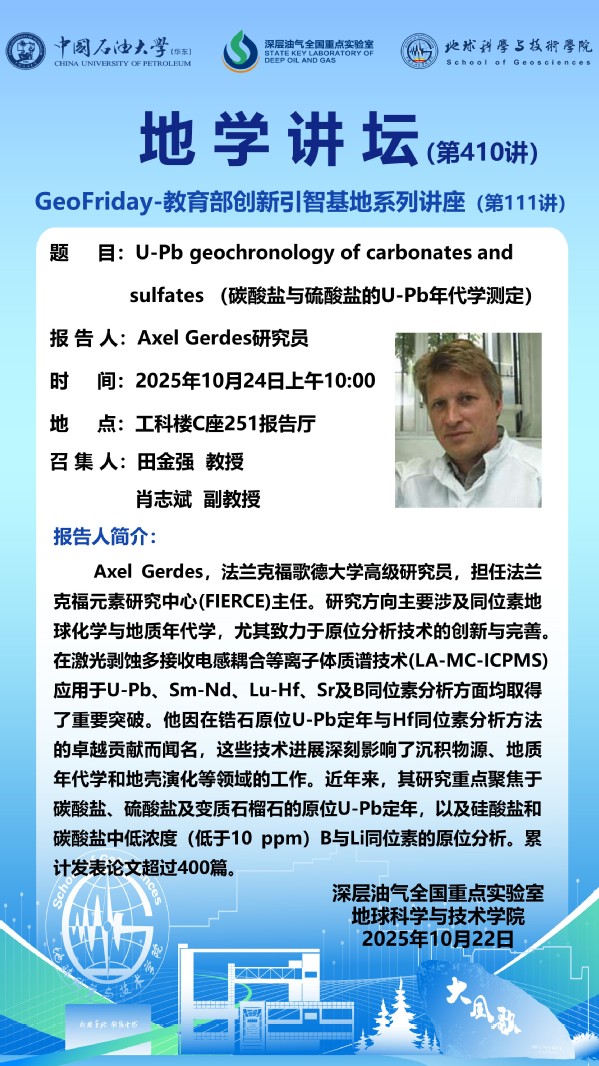 【地学讲坛第410讲】关于Axel Gerdes研究员《U-Pb geochronology of carbonates and sulfates 》学术报告的通知