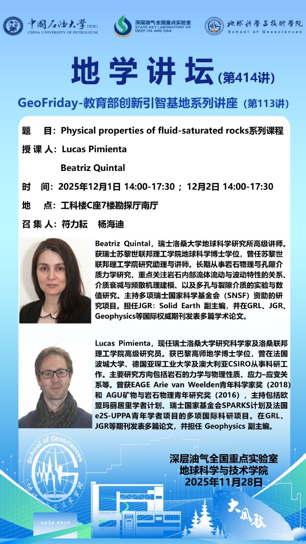 【地学讲坛第414讲】关于Lucas Pimienta 和 Beatriz Quintal 两位专家《Physical properties of fluid-saturated rocks》系列课程的通知