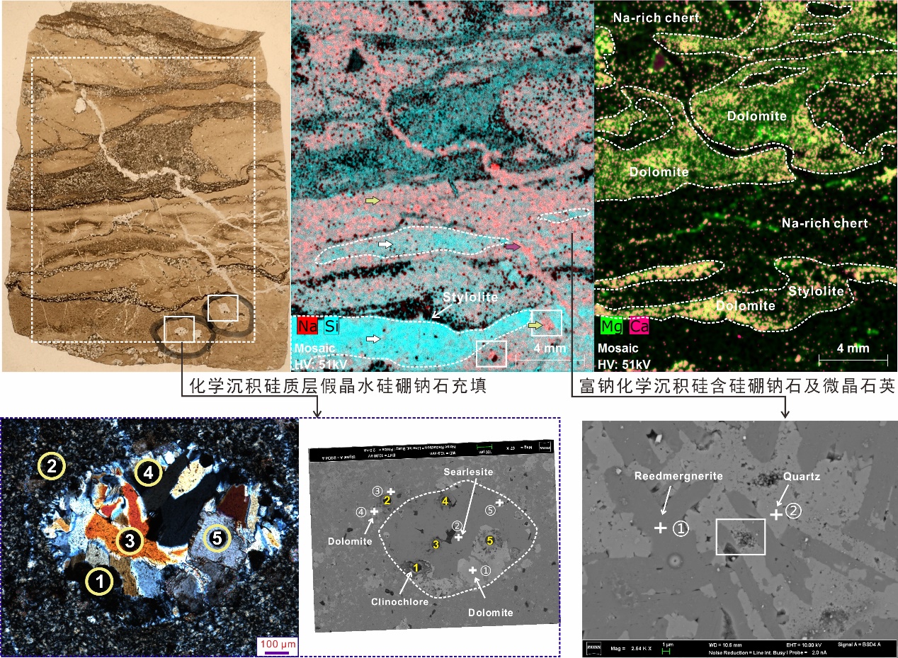 本次研究分别选取了位于蒸发盆地蒸发中心的岩心段和位于盆地边缘的岩心段开展相关研究。盆地中心蒸发序列研究表明:①硅硼钠石中的硼元素主要来源于富硼火山及火山相关的热泉;②碱盐发育层段成岩矿物的交代过程为:天然碱蒸发沉淀→丝硅镁石(热水富镁环境下的自生黏土矿物)交代天然碱→硅硼钠石在丝硅镁石晶间沉淀。蒸发韵律中的硼元素富集与火山和热水地质事件相耦合;地层序列中硅硼钠石的含量指示了沉积环境中的火山和热活动等重要地质事件。